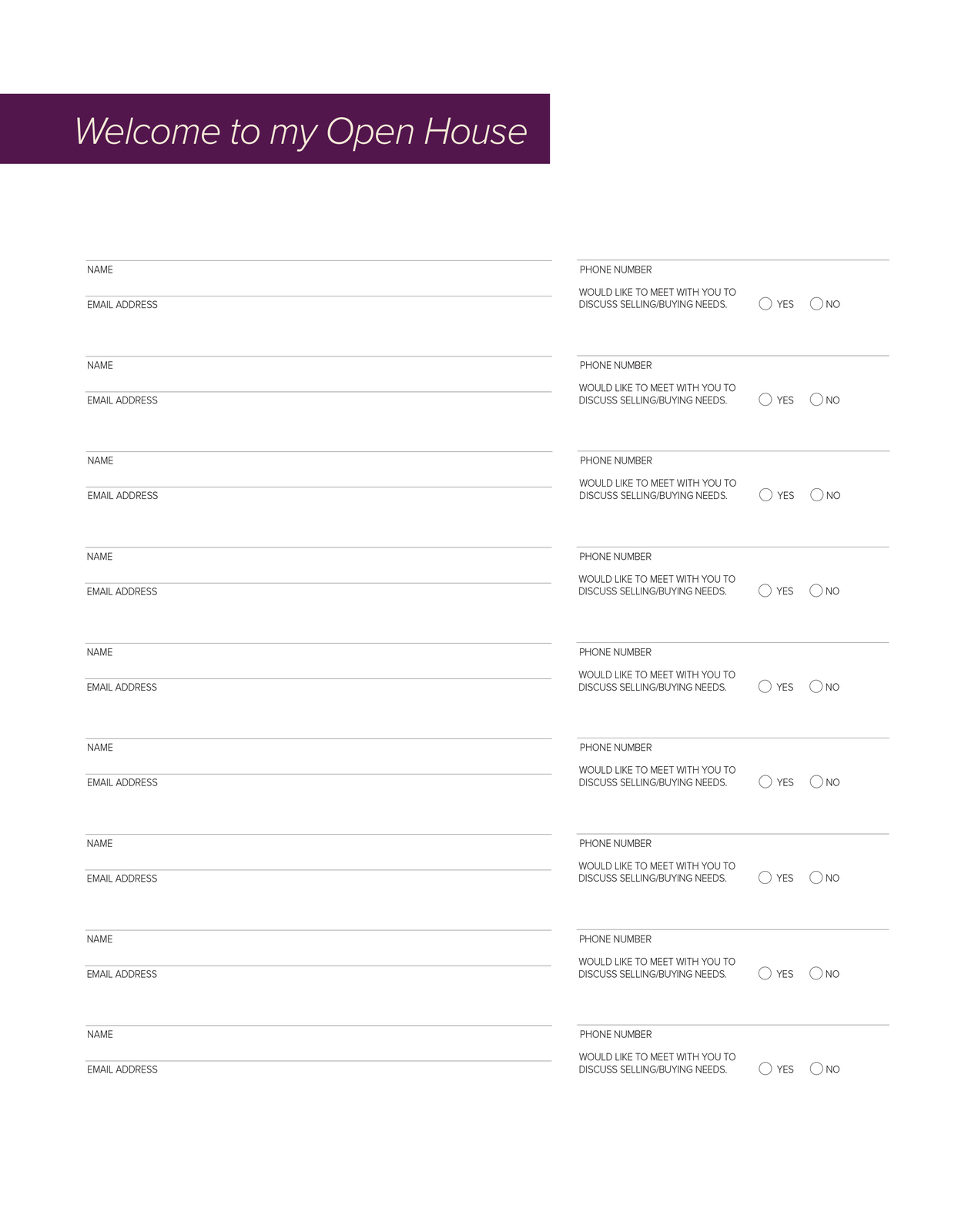 However, depending on how you . Open houses are critical to most real estate agents' lead generation strategy. Potential buyers will then see it . Don't place it directly beside the . The uses of an open house sign in sheet · real estate agents can boost their chances of making a sale or getting new clients as long as they .